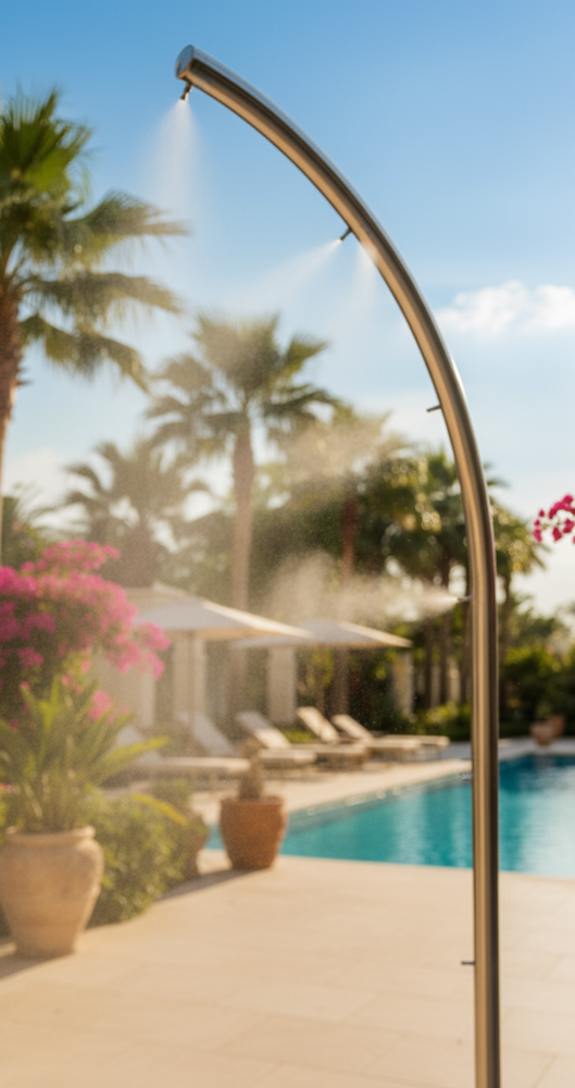 Wyposażony w 6 dysz zamgławiających płaskostrumieniowych ze stali nierdzewnej. Dysze są antywandalowe. Zużycie wody to jedyne 33 l na godzinę (przy ciśnieniu 3 barów). Wykonany w całości ze stali nierdzewnej.